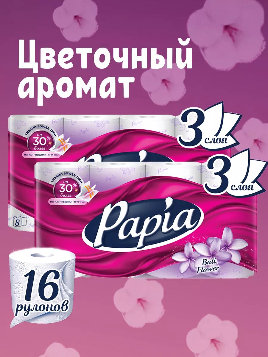 Туалетная бумага Papia Bali Flower белая с цветочным ароматом, 3 слоя, 8 рулонов