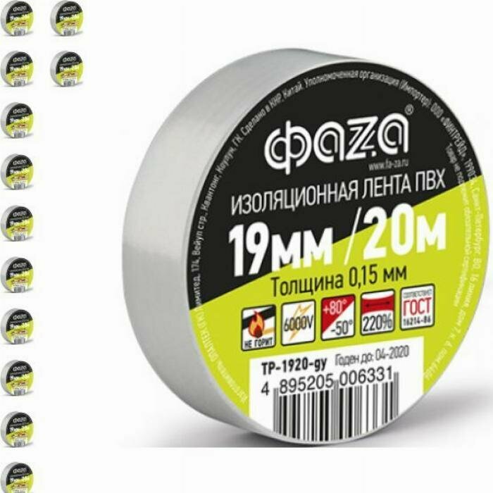 Купить Изолента ПВХ фаза 19 мм 20 метров серая (комплект из 12 шт)