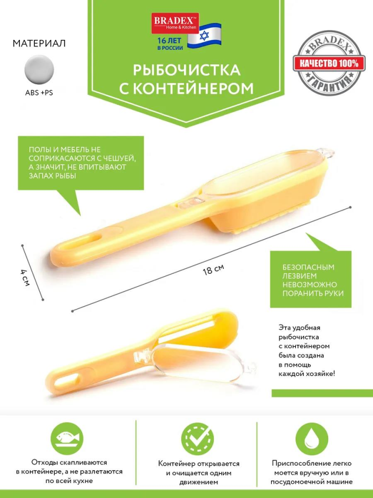 Bradex TK 0191 Рыбочистка с контейнером, 18x4 см, АВС пластик, желтый
