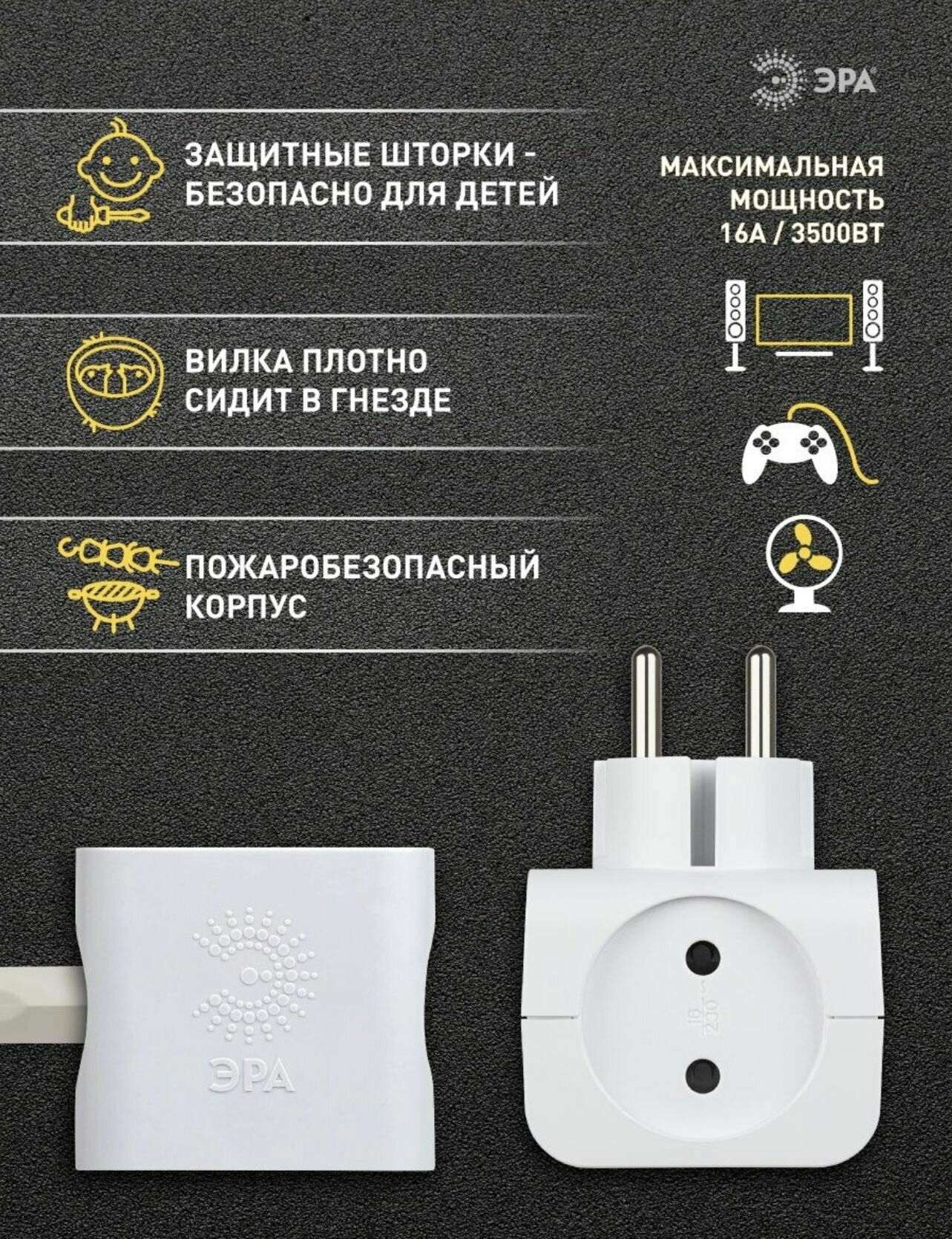 Тройник Эра "SP-4", белый, 4 разъема, негорючий поликарбонат, латунные контакты, максимальная нагрузка 16А/3680 Вт