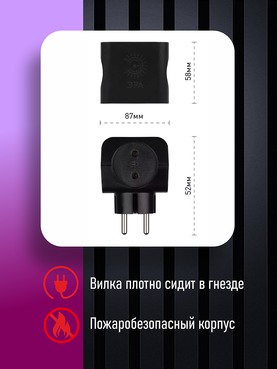Тройник Эра "SP-4",черный, 4 разъема, негорючий поликарбонат, 16А/3680 Вт