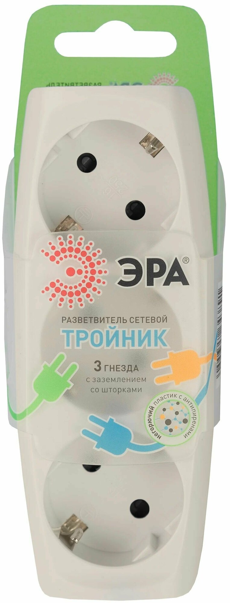 Тройник Эра "SP-3e", белый, 3 разъема, негорючий поликарбонат, шторки, заземление, 16А/3680 Вт.