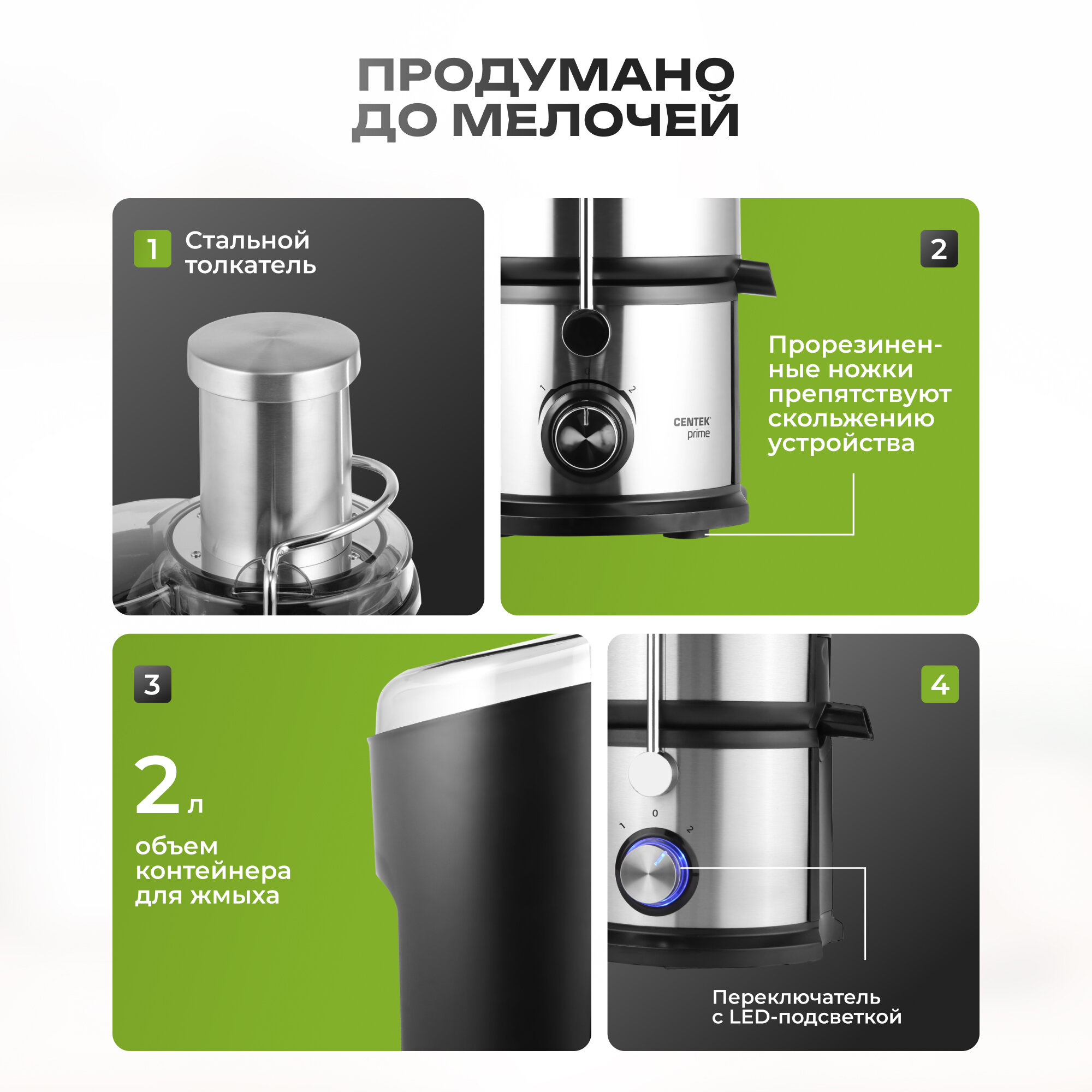 Соковыжималка CENTEK CT-1214 1500 Вт, резерв сока: 1,1л, черный/серебристый