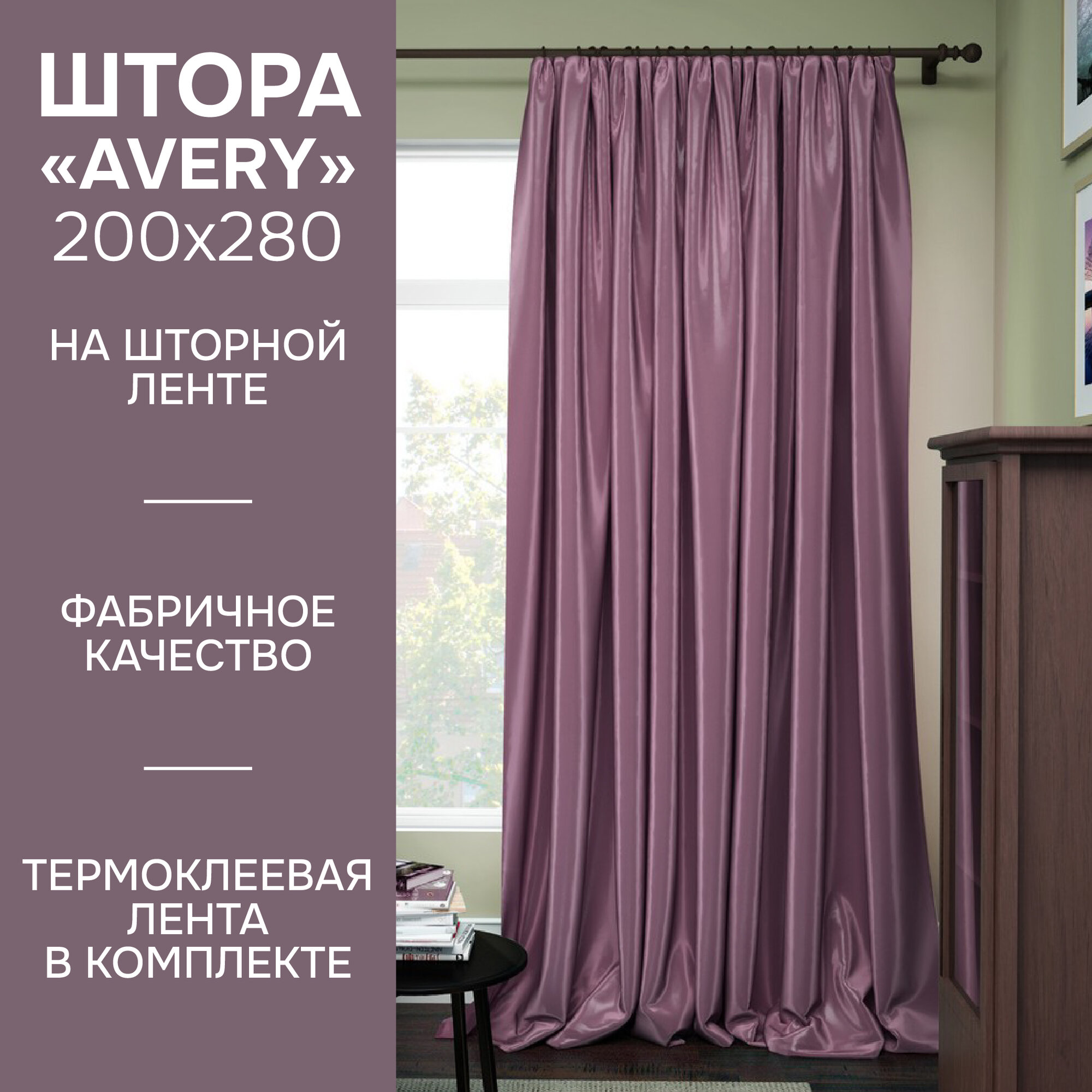 Штора на тесьме Avery 200х280 см, сатин, сиреневый, Kauffort
