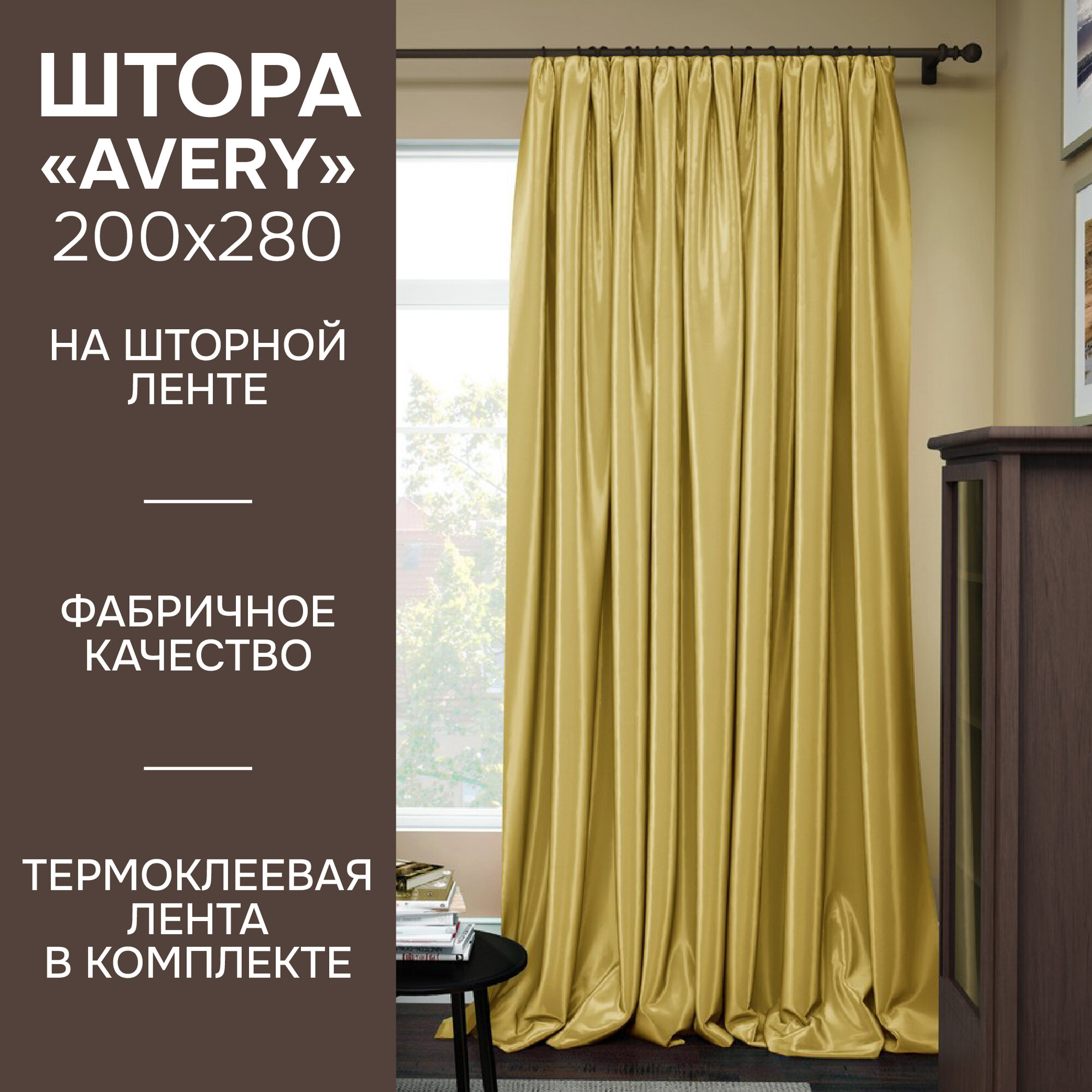 Штора Avery на тесьме 200х280 см, сатин, золотистый, Kauffort