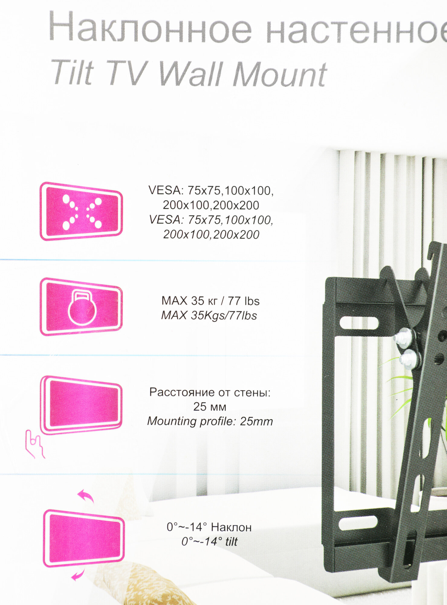 | Плюсы: | Отличный кронштейн за невысокую стоимость. В комплекте есть крепления для самого телевизора, уровень, а также крепления для стены. Для телевизора с диагональю 32 дюйма подходит как родной. |