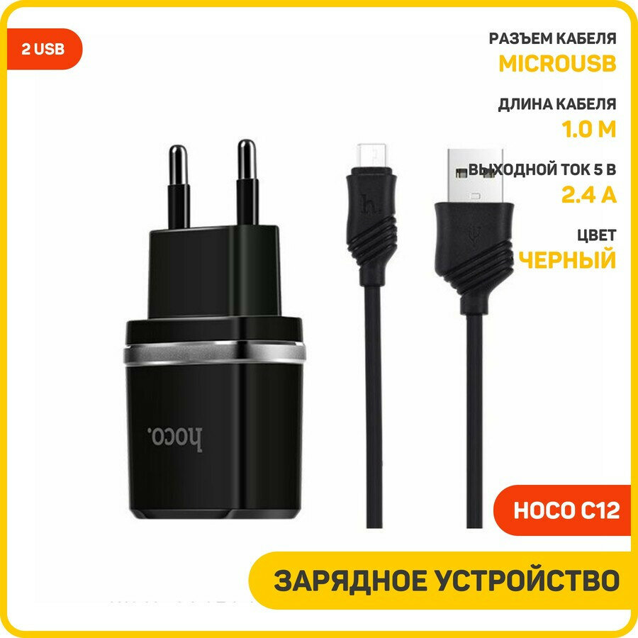 Сетевое зарядное устройство (СЗУ) Hoco C12 (2 USB) + кабель MicroUSB, 2.4 А, черный