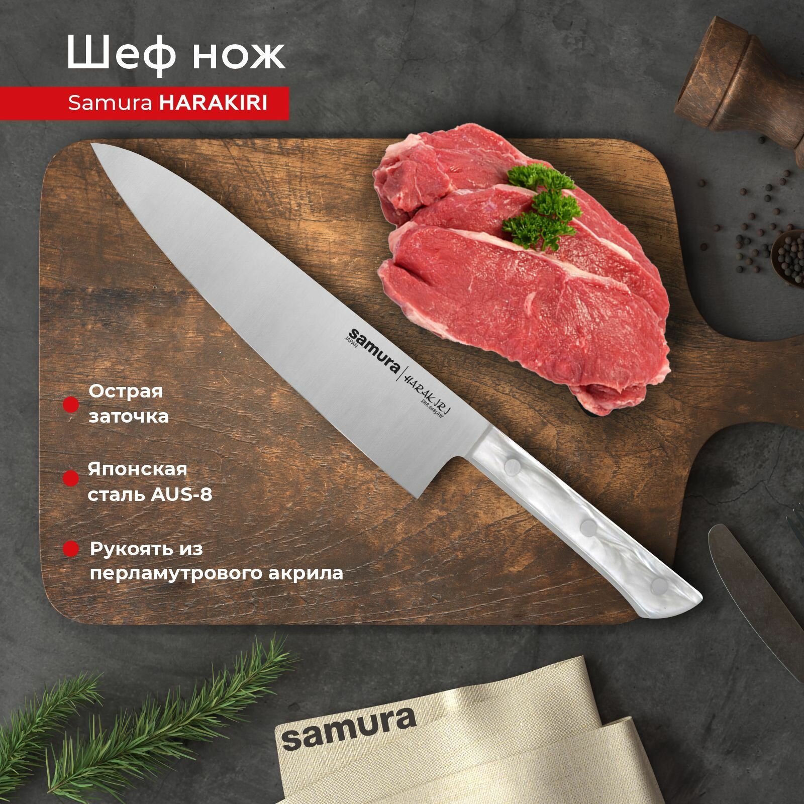Ниже Вы можете прочитать отзывы на Нож кухонный поварской Samura Harakiri Шеф для разделки нарезки профессиональный SHR-0085AW, ознакомится с подробными характеристиками, посмотреть интересные обзоры и фотографии на Нож кухонный поварской Samura Harakiri Шеф для разделки нарезки профессиональный SHR-0085AW.