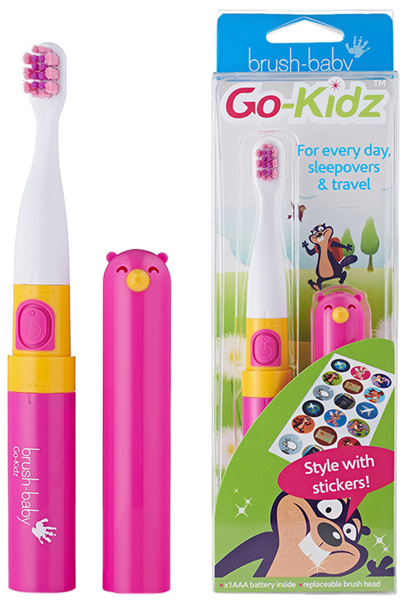 Детская электрическая зубная щетка Brush-baby Go-Kidz, розовая, от 3-х лет с наклейками