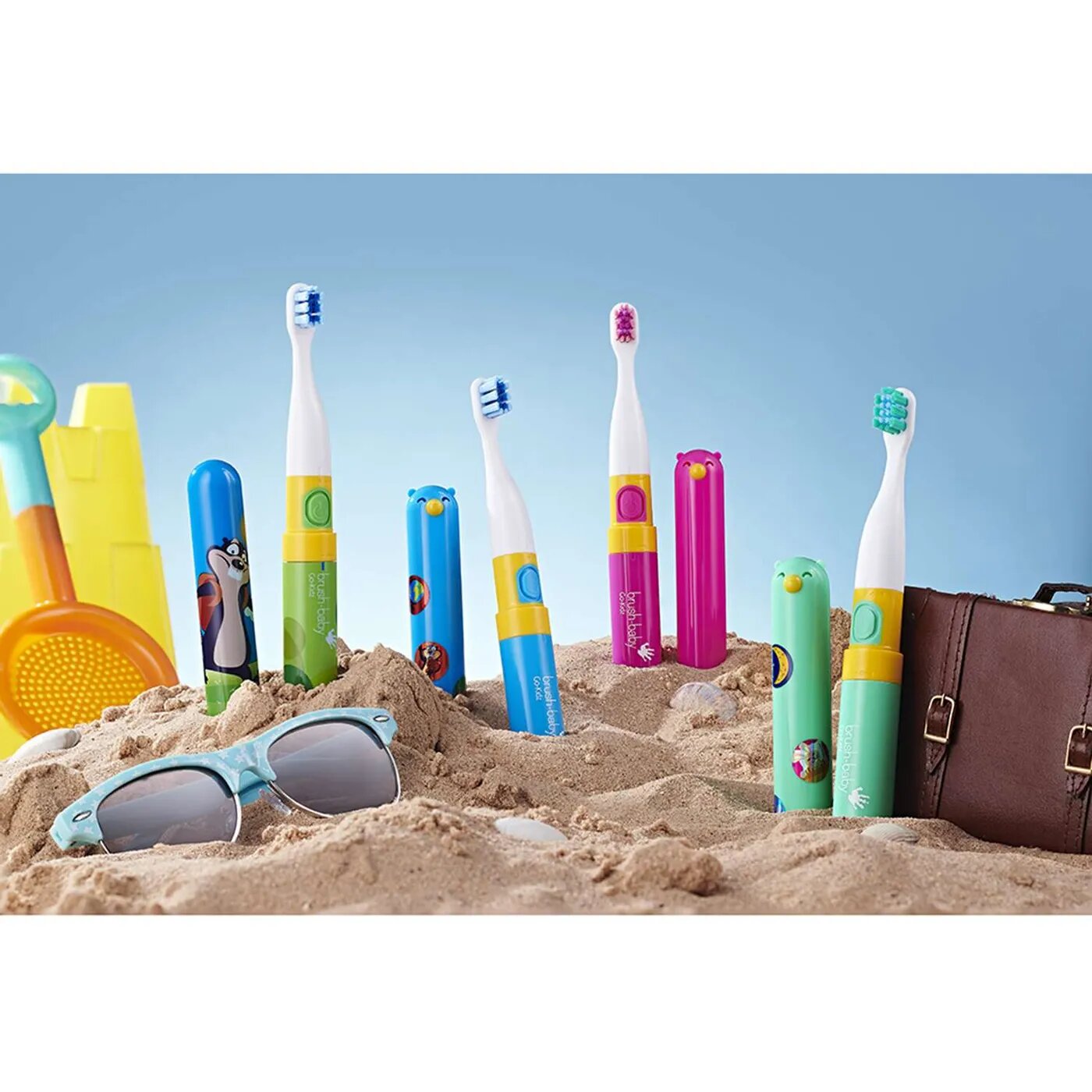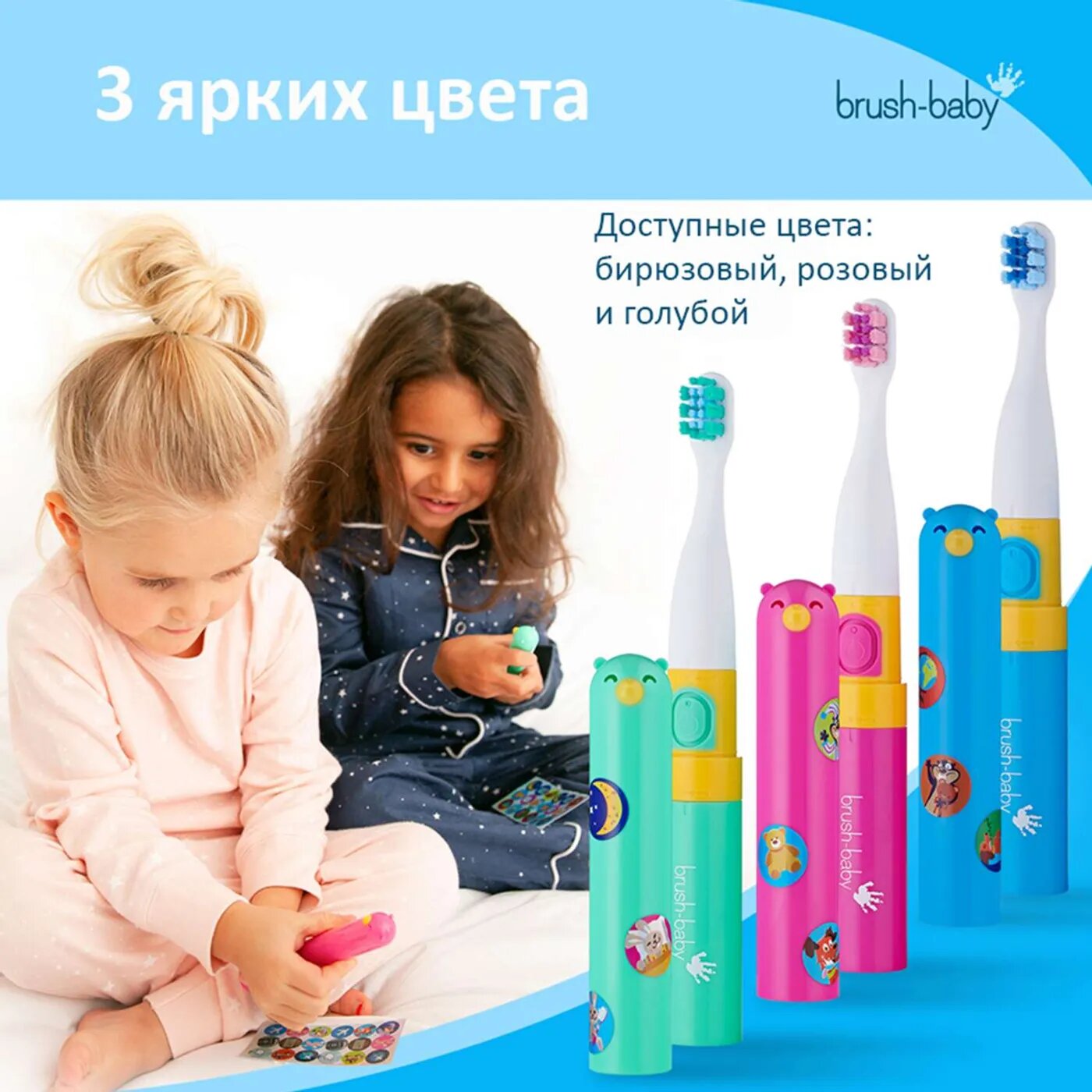 Детская электрическая зубная щетка Brush-baby Go-Kidz, бирюзовая, от 3-х лет с наклейками