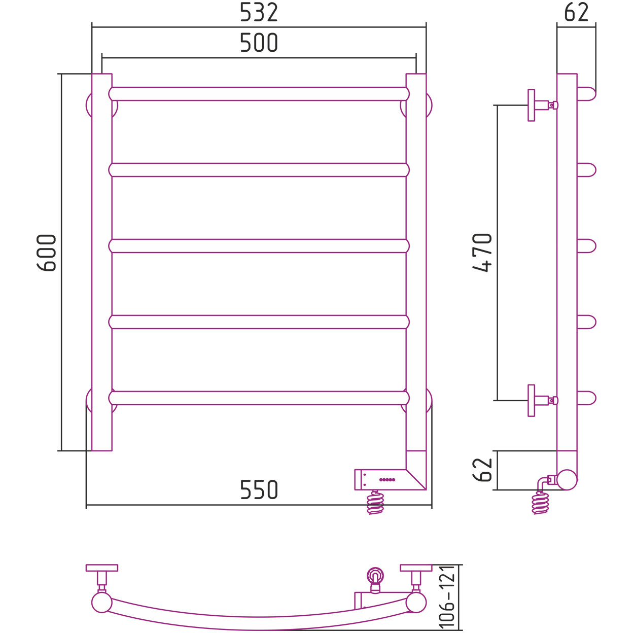 Полотенцесушитель электрический Сунержа 15-5201-6050 Галант 2.0 Полотенцесушитель электрический РЭБ, 600х500 мм/ МЭМ правый, муар темный титан