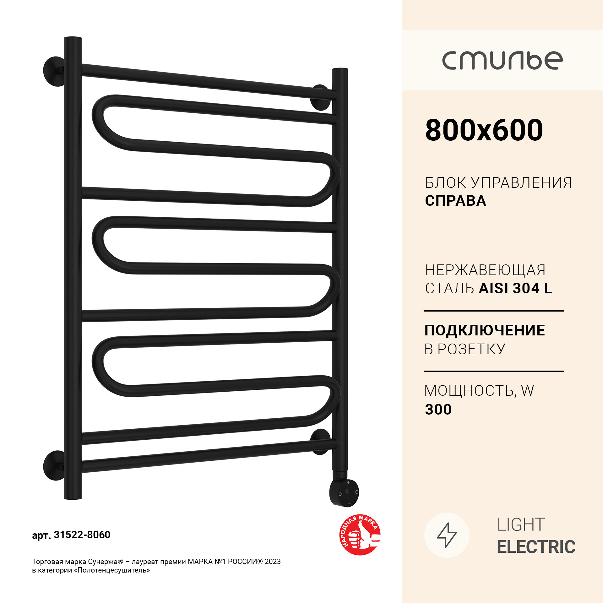 Полотенцесушитель электрический Стилье Формат 22 800х600 правый Матовый черный 31522-8060
