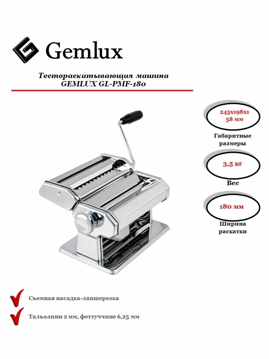 Машинка для раскатки теста Gemlux GL-PMF-180 с насадкой