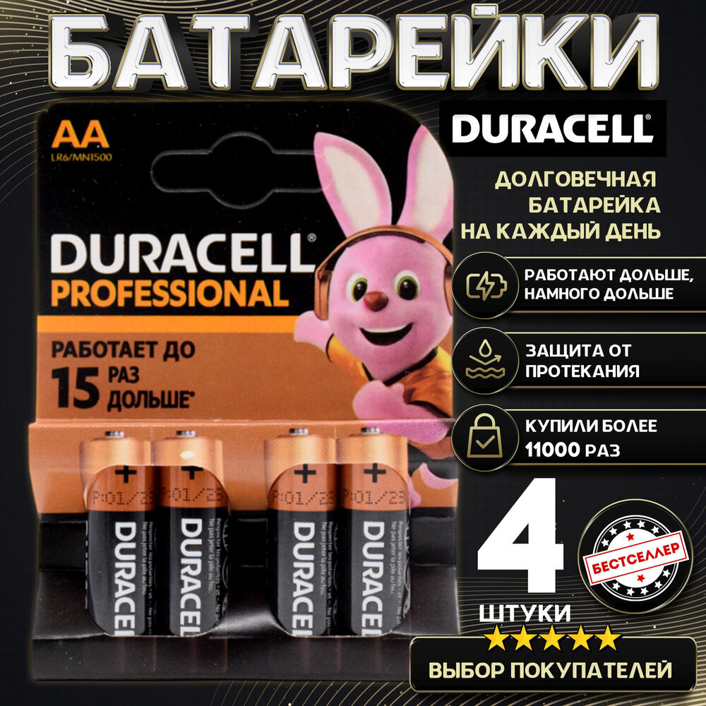 Батарейки DURACELL PLUS AA, 4 шт, щелочные, блистер, пальчиковые.