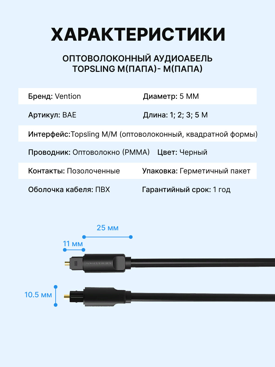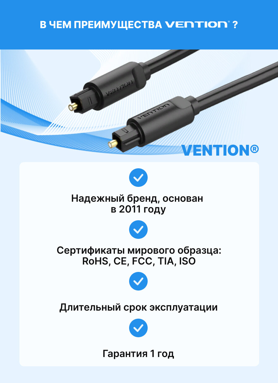 Кабель Vention аудио оптоволоконный Toslink M/Toslink M - 3 м Кабель Vention Toslink(m)/Toslink(m) - 3 м (BAEBI)