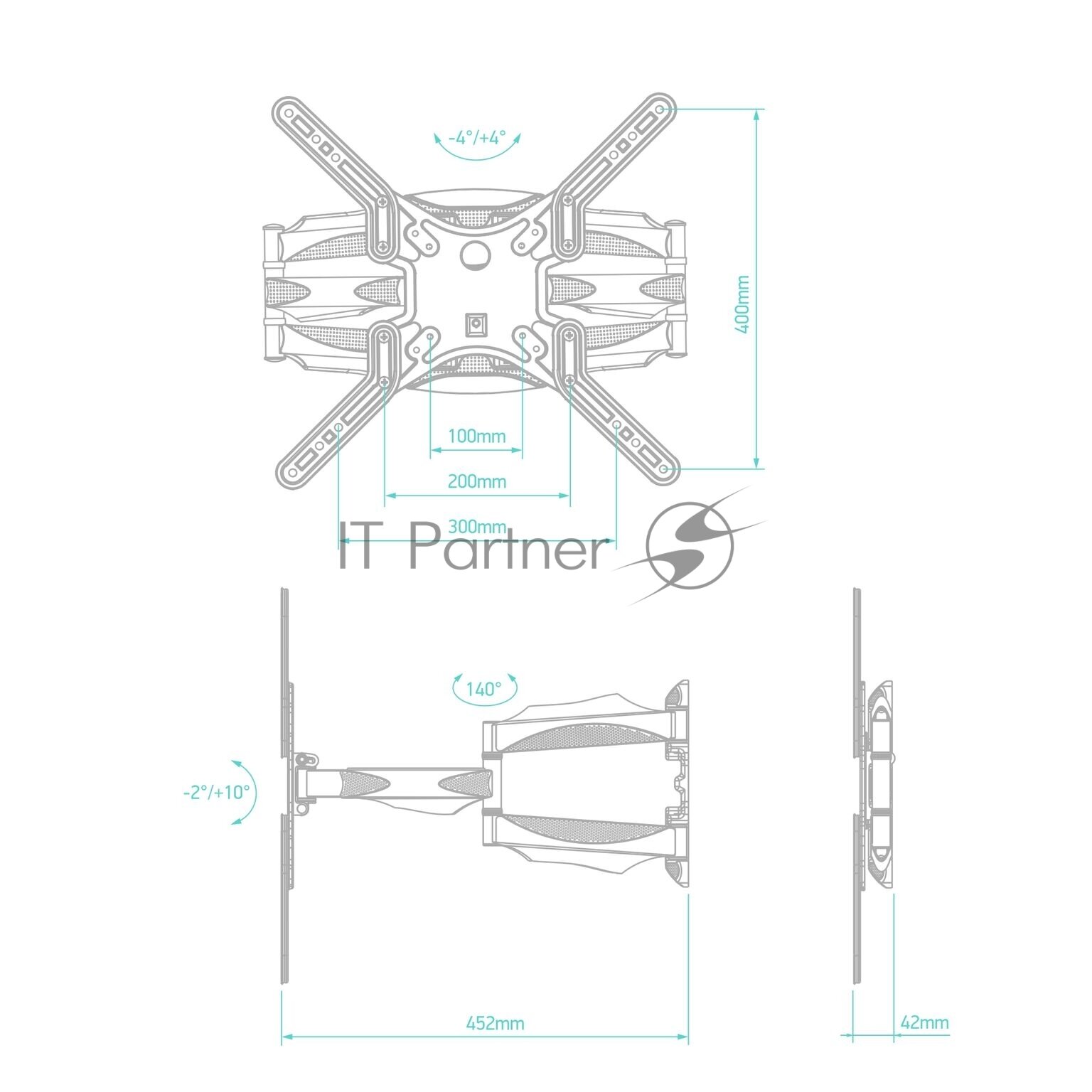 Кронштейн ONKRON/ 37-70" макс 400*400 наклон -2°/+10° поворот 140º Макс нагрузка 36,4кг от стены: 42-452мм, "гармошка", черный