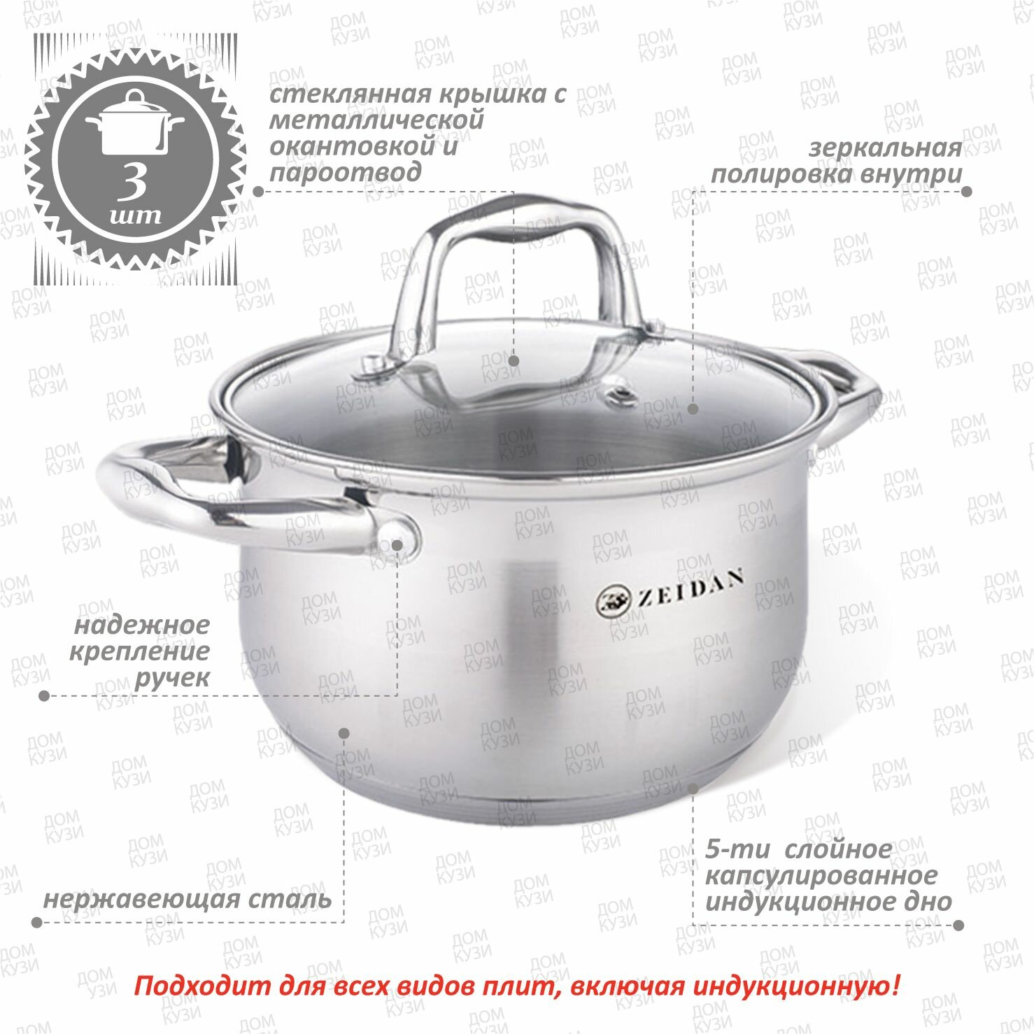 Набор посуды для приготовления из нержавеющей стали Zeidan кастрюли 2.1, 3 и 4 литра с крышками для газовых, электрических и индукционных плит
