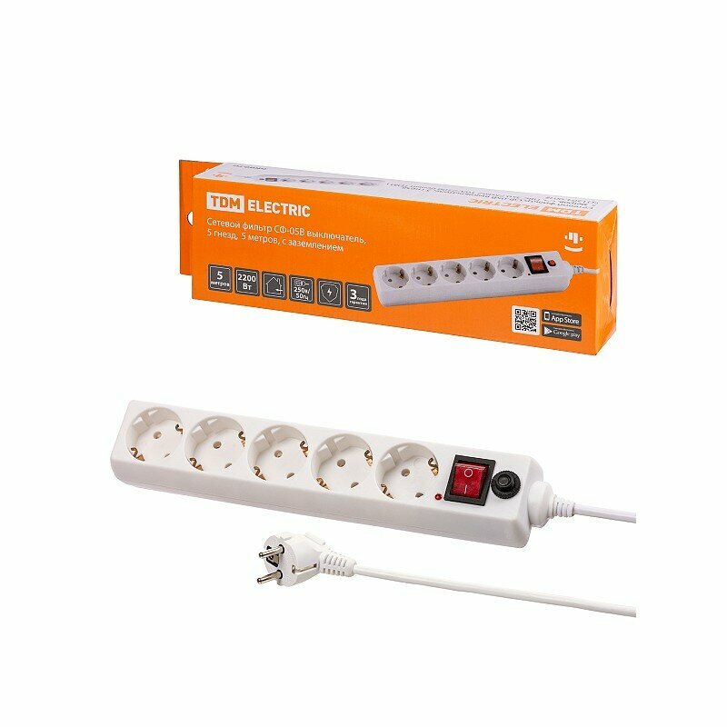 Сетевой фильтр TDM СФ-05В, 5 гнезд, с заземлением и выключателем, ПВС 3x1, 5м