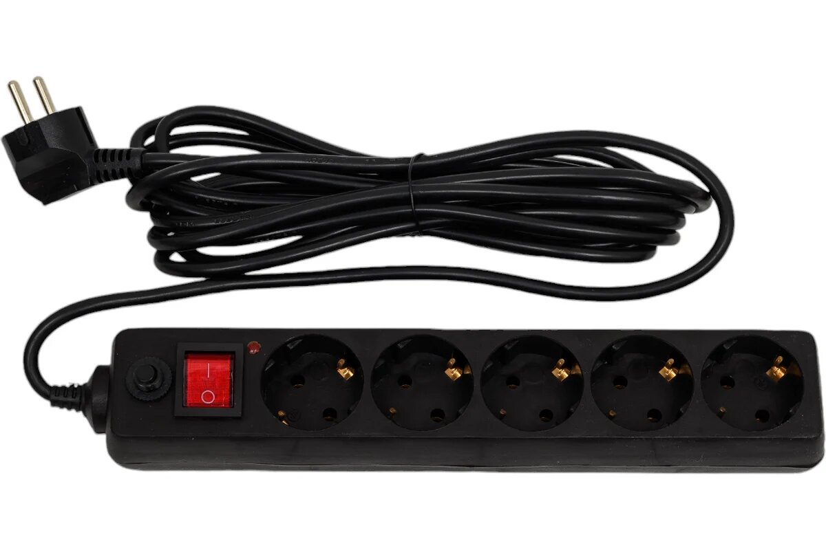 Сетевой фильтр c выключателем, 5 гнезд, 5 метров, с заземлением, ПВС 3х1мм2 16А/250В черный TDM