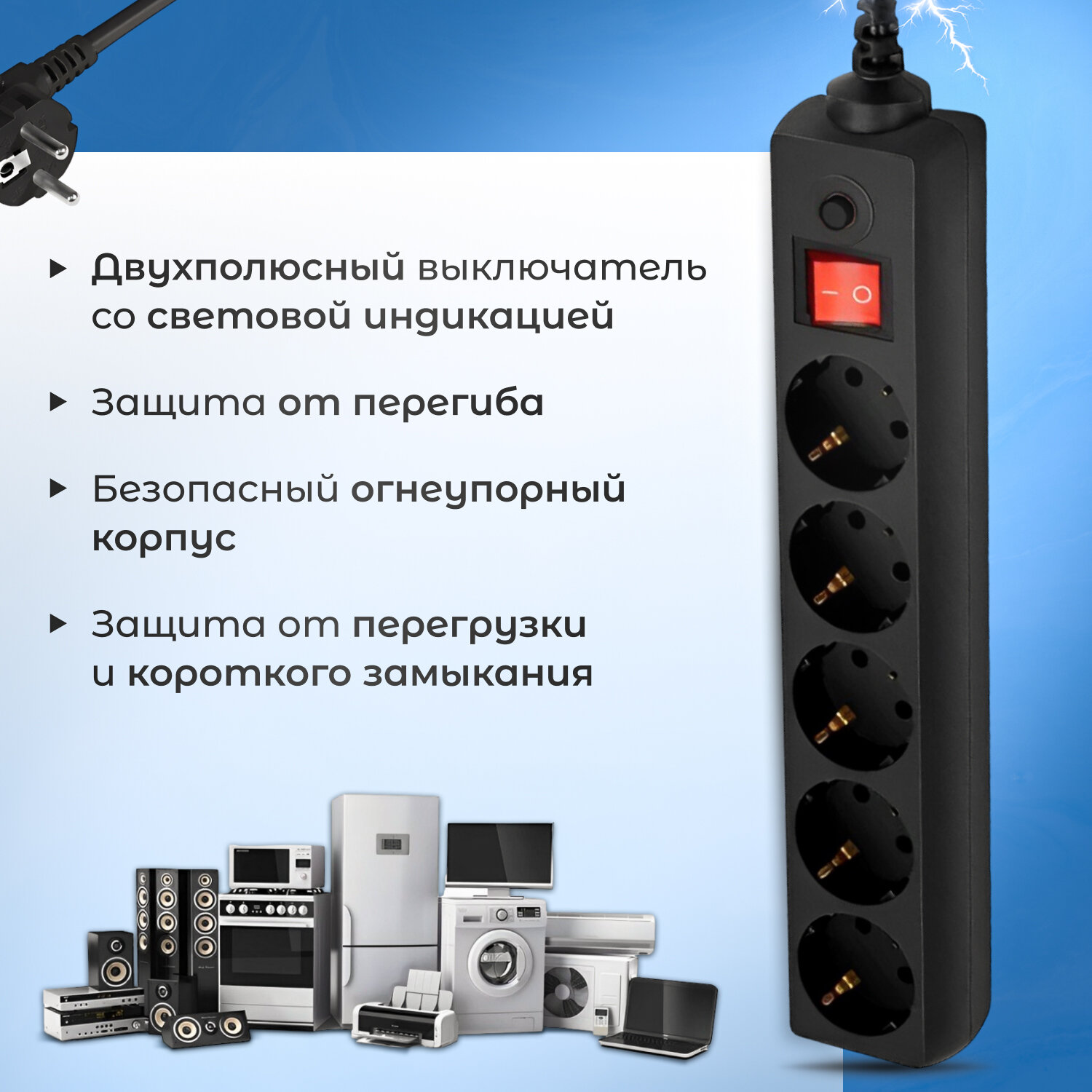 Сетевой фильтр СФ-05В выключатель, 5 гнезд, 5 метров, с заземлением, ПВС 3х1мм2 16А/250В черный TDM 1 шт {SQ1304-0003}