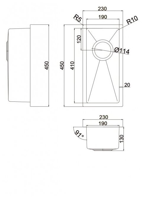 Мойка для кухни из нержавеющей стали Емар EMB-113 PVD Nano Dark квадратная черная 450х450мм глубина чаши 230мм диаметр слива 114мм / раковина