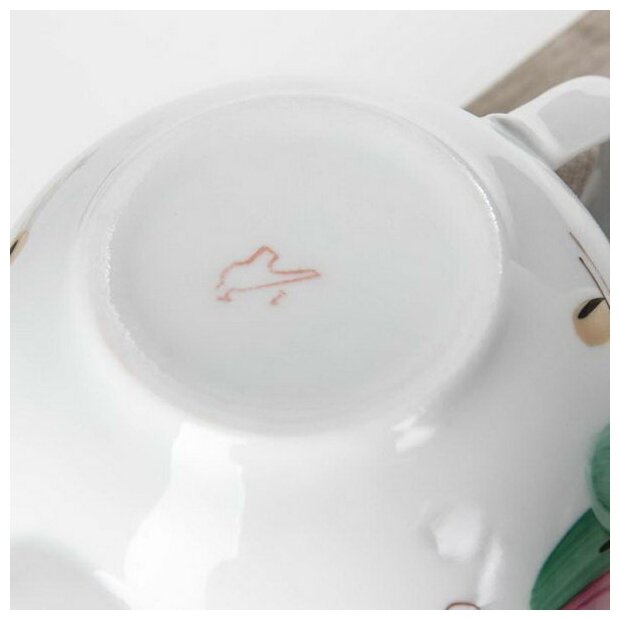 Позолота не стирается - пользуемся уже порядка 3-4 месяцев. Заварка не выливается через край - носик чайника выше основания крышечки, в которой есть дырочка, как есть дырочки в месте крепления носика к корпусу чайника. Очень элегатно смотрится, заварки требует немного, хотя ее приходится часто менять. Тепло с грелкой держит долго. Покупали за 450 рублей. Очень довольны. На донышке с внешней стороны есть фирменное клеймо. |