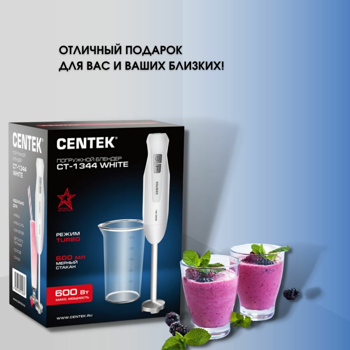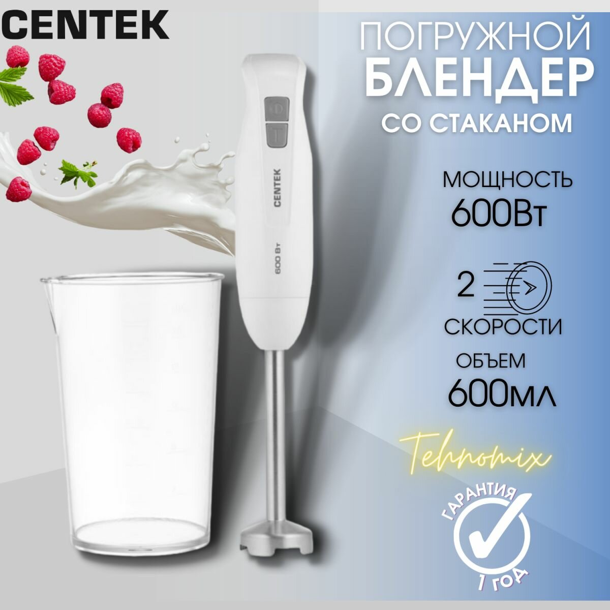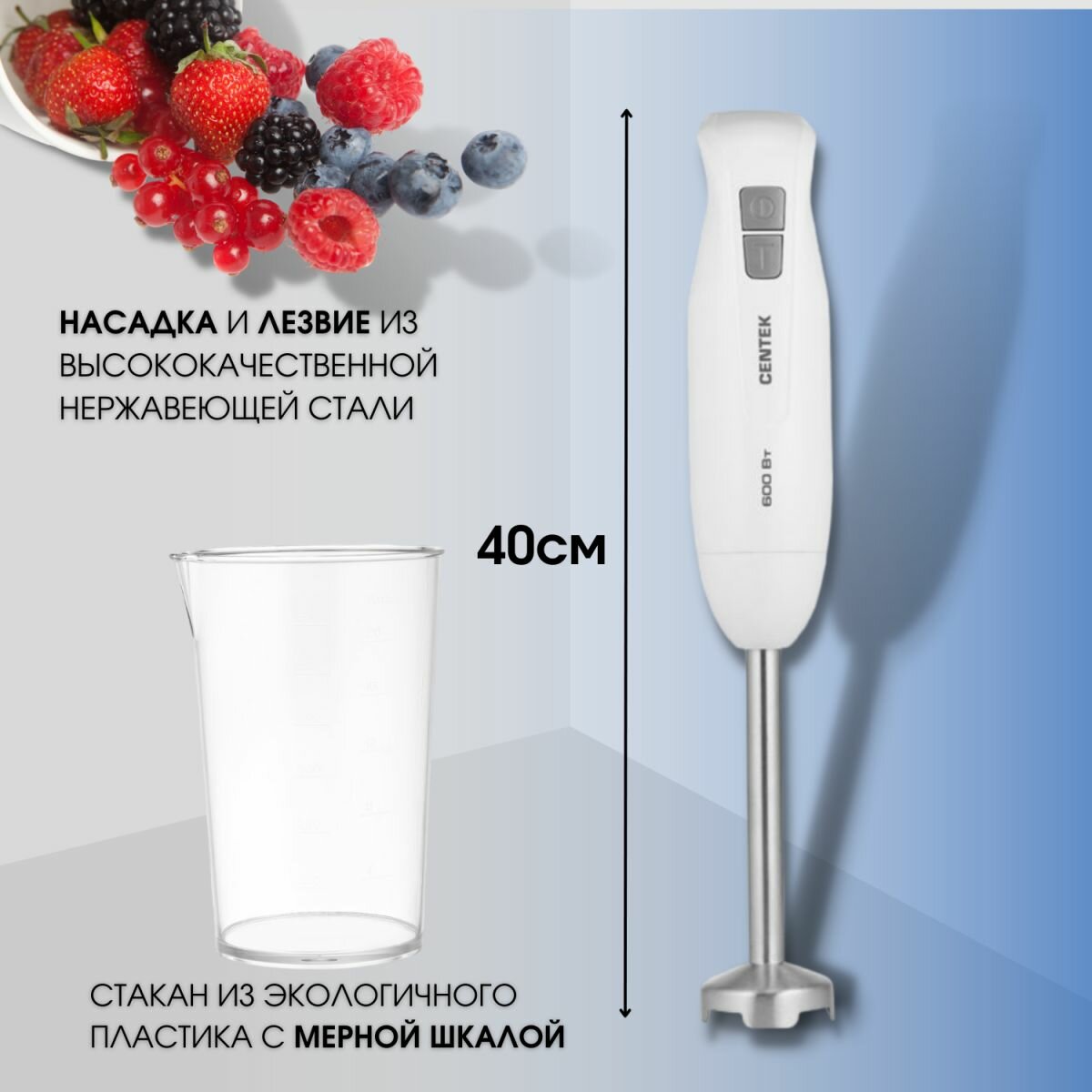 Погружной блендер Centek CT-1344 600Вт, турбо режим, специальная заточка лезвий, стакан 600мл