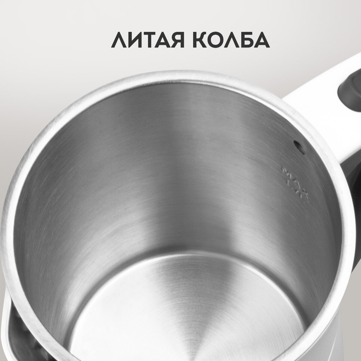 | Плюсы: | Крышка чайника открывается таким образом, что совсем не нависает над колбой - максимально полный доступ к внутреннему пространству чайника: сплошная стальная колба с штампованной шкалой уровня воды. |