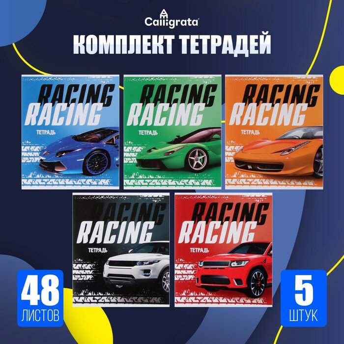 Комплект тетрадей из 5 штук (4 разные + 1 повторяющаяся), 48 листов в клетку Calligrata "Racing defender", обложка мелованная бумага, блок №2, белизна 75% (серые листы) интересное: