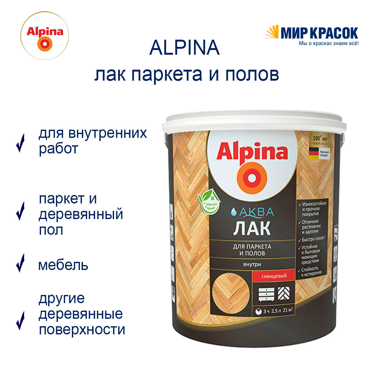 Альпина Аква лак акриловый для паркета и полов глянцевый (2,5л) / ALPINA Aqua лак акриловый для паркета и полов водоразбавляемый глянцевый (2,5л)
