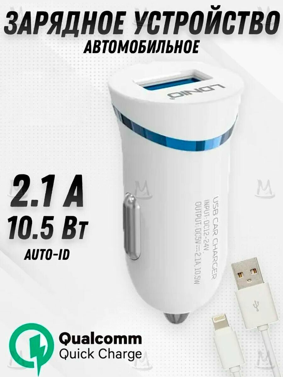 Автомобильная зарядка MyLatso LDNIO DL-C12 2,1A + кабель Lightning, зарядное устройство для авто 1 USB, ЗУ для машины