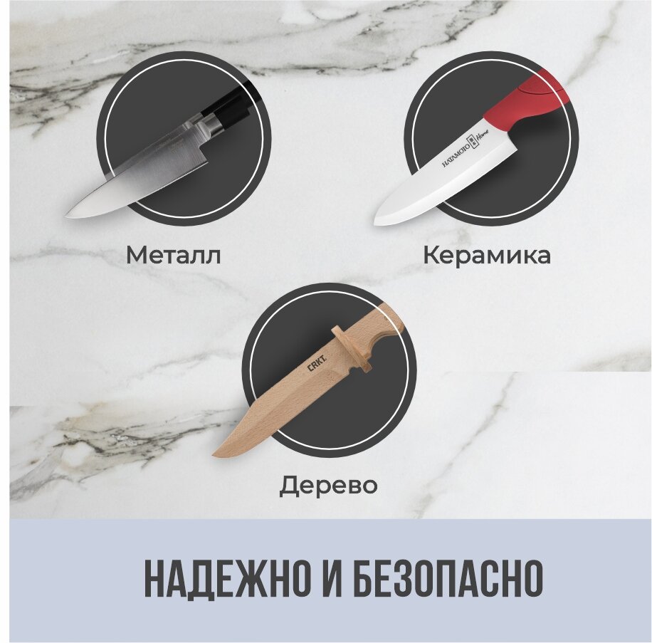 | Минусы: | После пяти ножей, очень сложно туда ещё что то добавить |