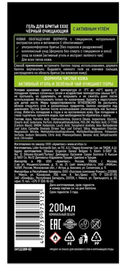 Гель для бритья "exxe" Черный для всех типов кожи 200мл С Активным Углем (24) Арвитекс .