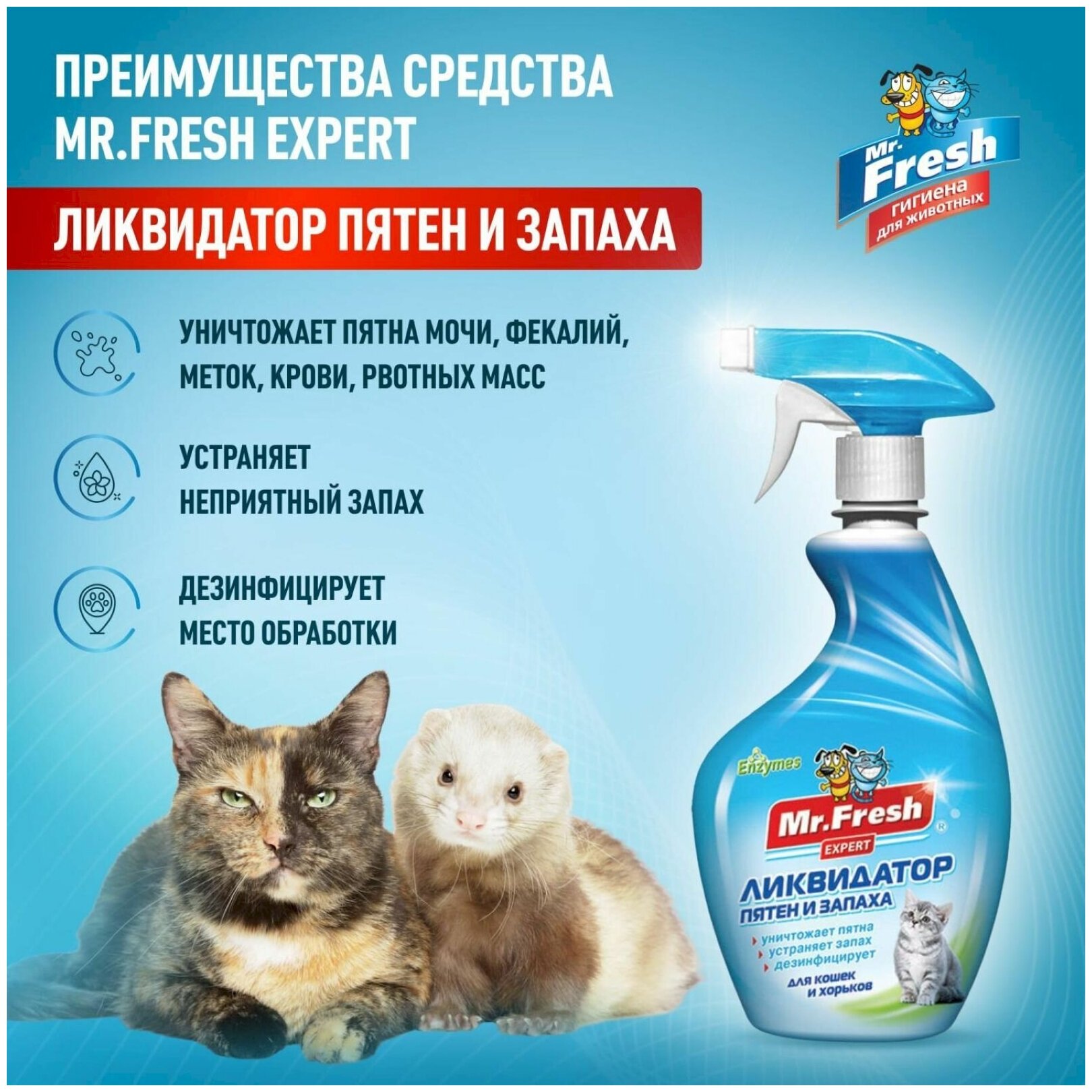Ликвидатор запаха и пятен для кошек и хорьков Mr.Fresh 500 мл интересное: