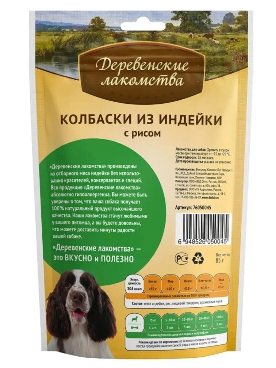 Деревенские лакомства 1шт х 85г колбаски из индейки с рисом для собак