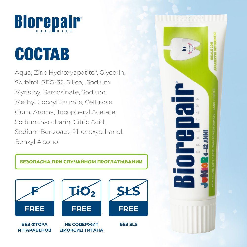 Зубная паста детская Biorepair Junior с экстрактом сладкой мяты от 6 до 12 лет, 75 мл