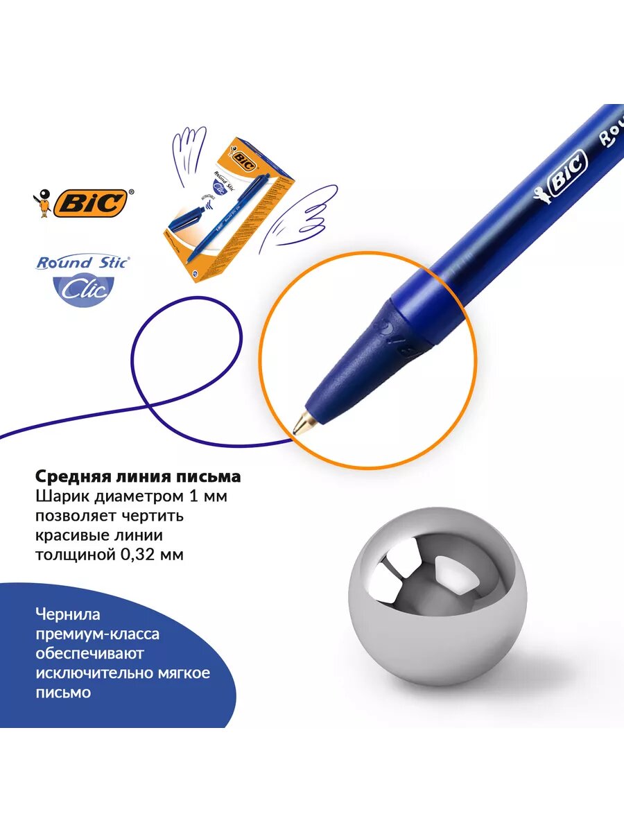 Ручка шариковая автоматическая Bic "Round Stic Clic" синяя, толщина стержня 1,0 мм, толщина линии письма 0,32 мм, упаковка 20 шт.