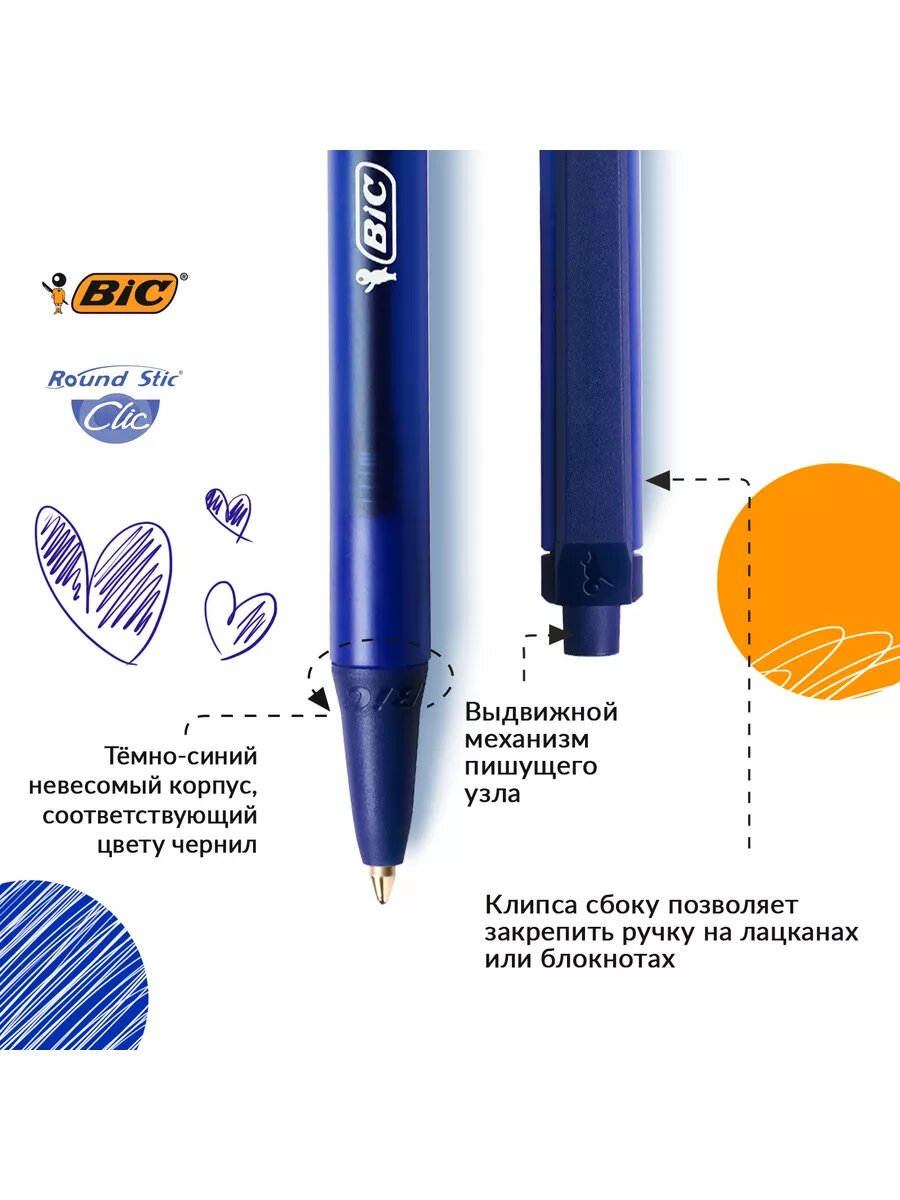 Комплект 53 шт, Ручка шариковая автоматическая BIC "Round Stic Clic", синяя, корпус тонированный синий, узел 1 мм, линия письма 0.32 мм, 926376
