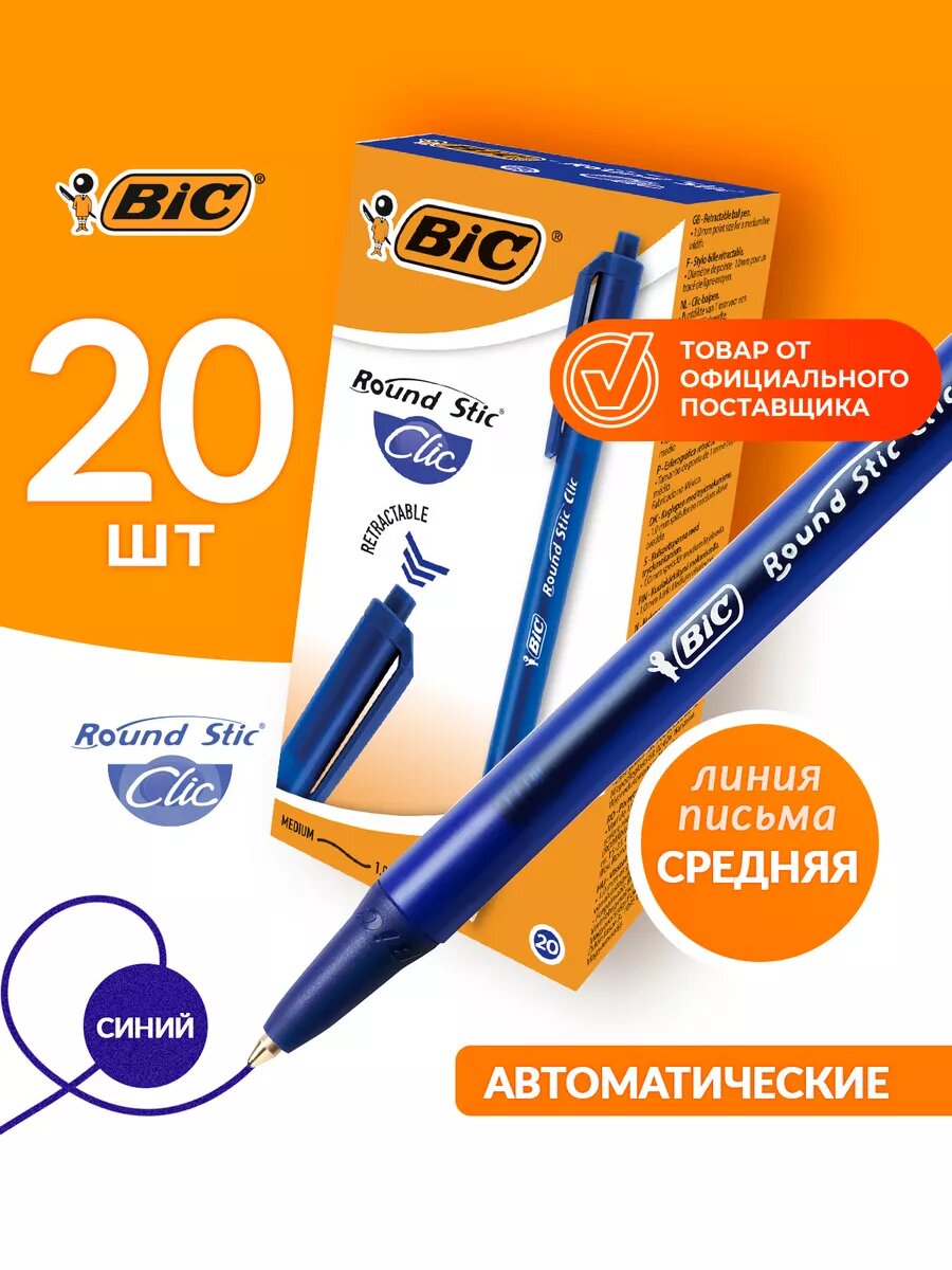 Ручка шариковая, автоматическая, чернила синие, 1.0 мм, среднее письмо, BIC Round Stic Clic, 20 шт.