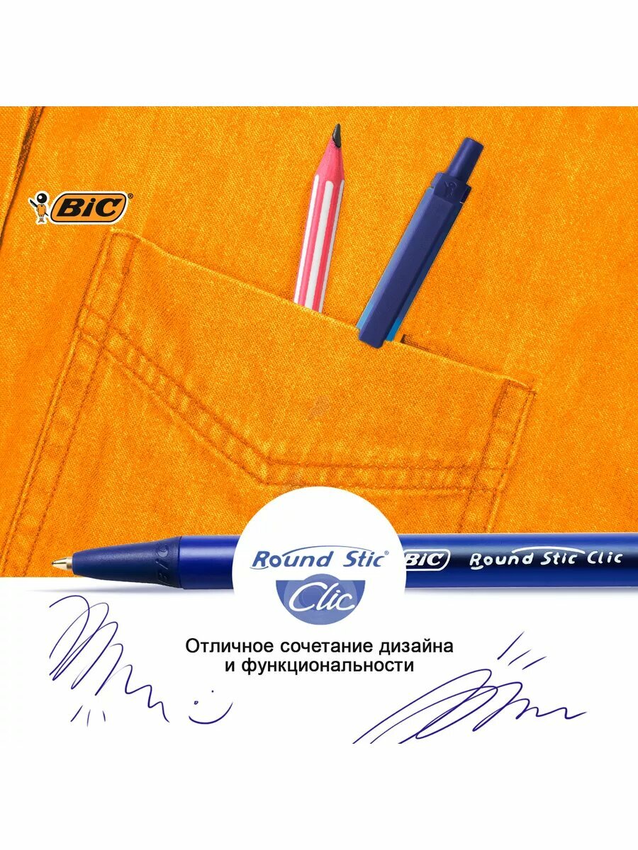 Ручка шариковая автоматическая BIC Round Stic Clic, синяя, корпус тонированный синий, узел 1 мм, линия письма 0,32 мм, 926376, (20 шт.)