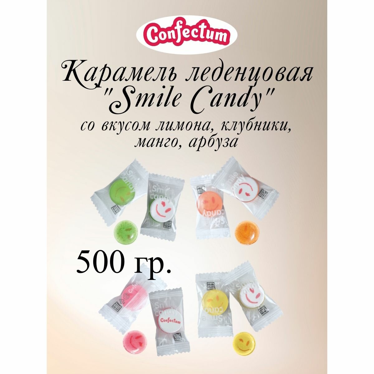 Карамель леденцовая "Smile Candy" со вкусом лимон, клубника, манго, арбуз, Confectum, 500 г. интересное: