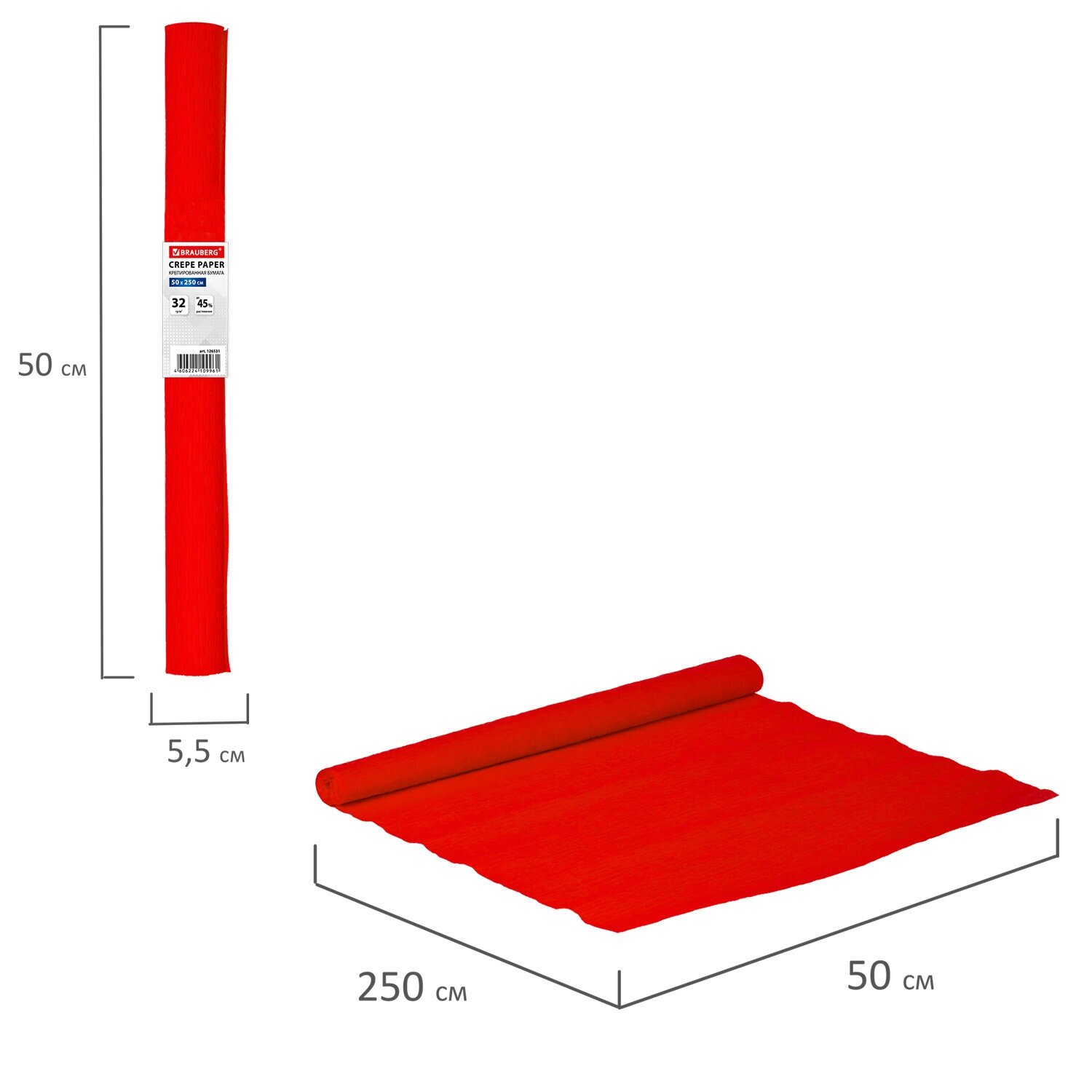 Бумага гофрированная/креповая, 32 г/м2, 50х250 см, красная, в рулоне, BRAUBERG, 126531, 126531