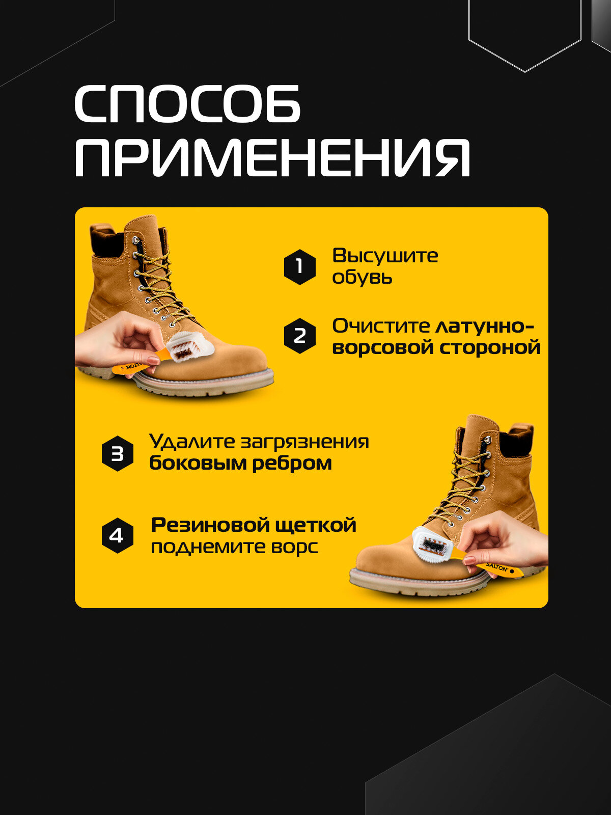 Легко удаляет загрязнения, с помощью бокового ребра можно легко очистить швы, имеется резиновая поверхность Недостатки: Недостатков не нашёл на данный момент Идеально подходит для обуви из замши и нубука |