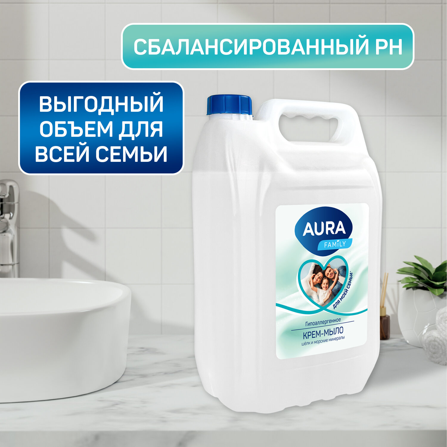 Жидкое мыло AURA FAMILY, для рук шёлк и морские минералы 5 л