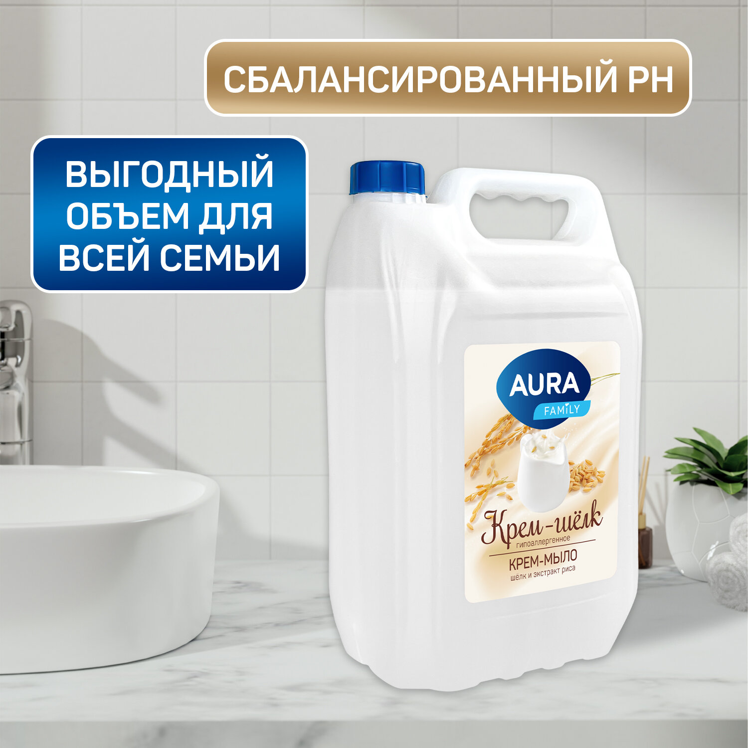 СохранитьЖидкое крем мыло для рук шёлк и экстракт риса 5 литров, AURA FAMILY интересное: