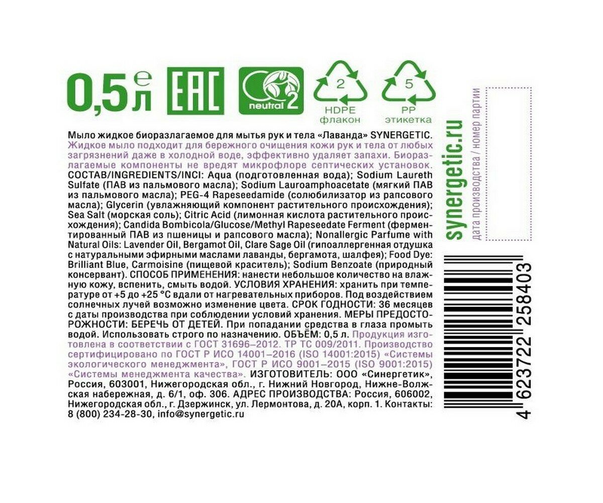 Synergetic Биоразлагаемое жидкое мыло Лаванда 0,5 л 0,5 л 1 шт