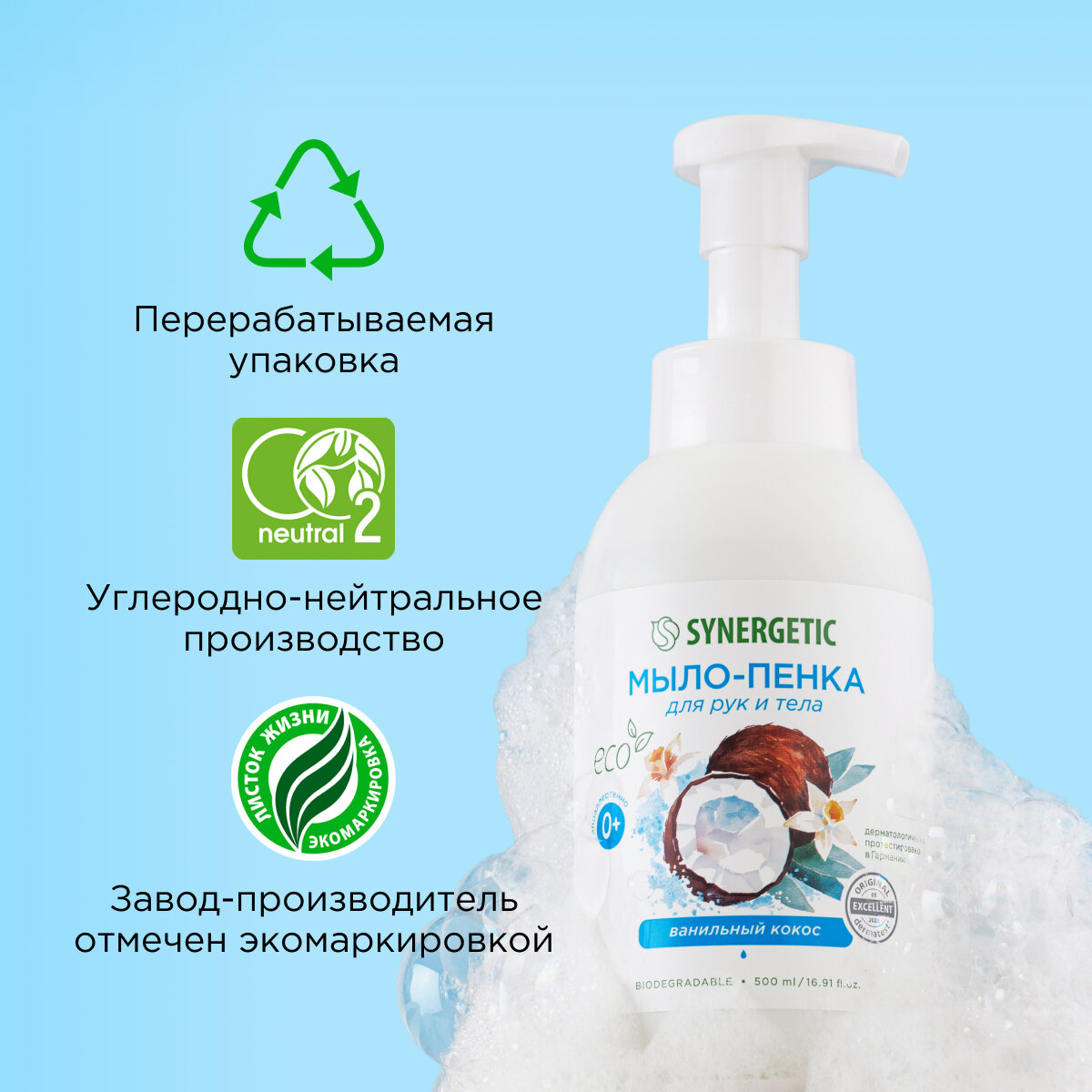 СохранитьГипоаллергенное натуральное детское мыло-пенка для рук и тела Synergetic Ванильный кокос, 500 мл интересное: