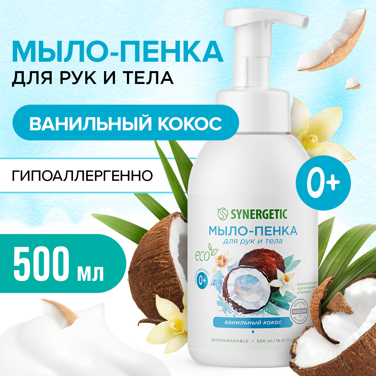Купить Гипоаллергенное натуральное детское мыло-пенка для рук и тела Synergetic Ванильный кокос, 500 мл