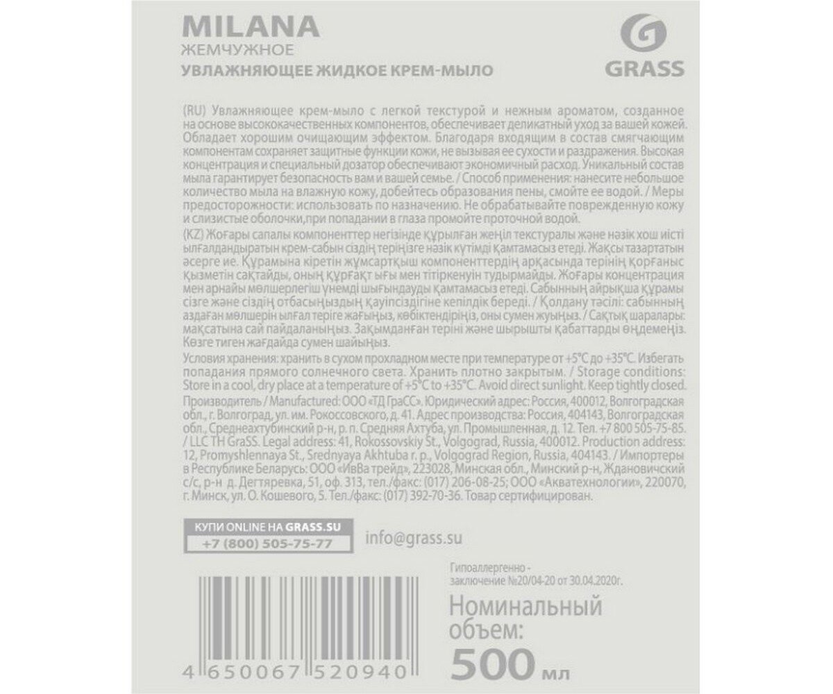 Крем-мыло Grass MILANA жемчужное с дозатором 0.5л