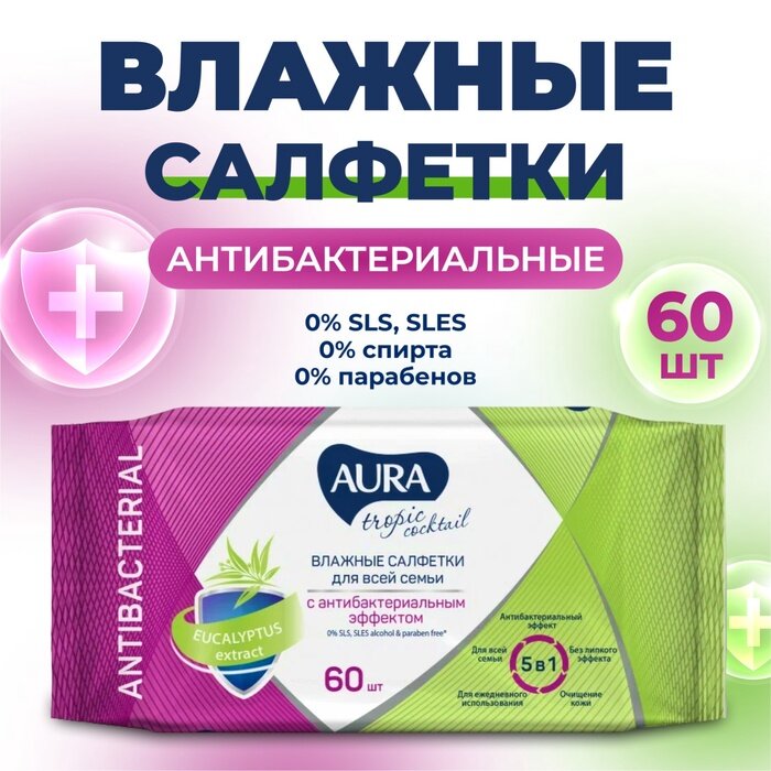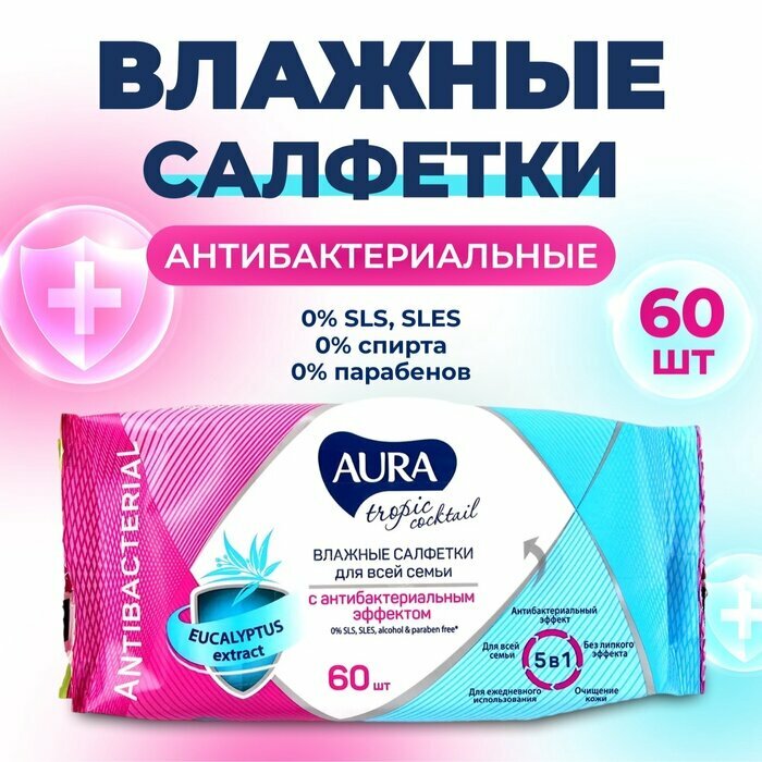 Салфетки влажные Aura tropic антибактериальный эффект 60 шт в ассортименте